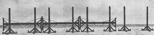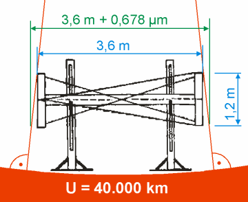 können. Es spielt dabei keine Rolle, ob unsere Erdoberfläche nun konkav oder konvex gekrümmt ist, da der Umfang in beiden zu betrachtenden Fällen fast gleich groß ist. Ein Geviert (s. Abbildung) ist eine Holzbalkenkonstruktion, die mit Drahtseilen verspannt ist. An den Stirnflächen der Querbalken sind Messingbleche angebracht, an denen das nächste Geviert angeschraubt wird. Diese Konstruktion soll extrem Winkelgenau sein, um damit eine sehr genaue gerade Strecke bauen zu können. Wie genau müssen nun die Gefierte sein, um wie behauptet die Krümmung eines Kreises mit 40.000 km Umfang mit 5%iger Toleranz messen zu können? Fällt man zwei Lote im horizontalen Abstand von 3,6 m, so beträgt über eine Höhe von 1,2 m die Abweichung von der Parallelität etwa 0,678 µm. (siehe Skizze) Die Parallelität der Messingplatten auf den Querhölzern muss folglich
