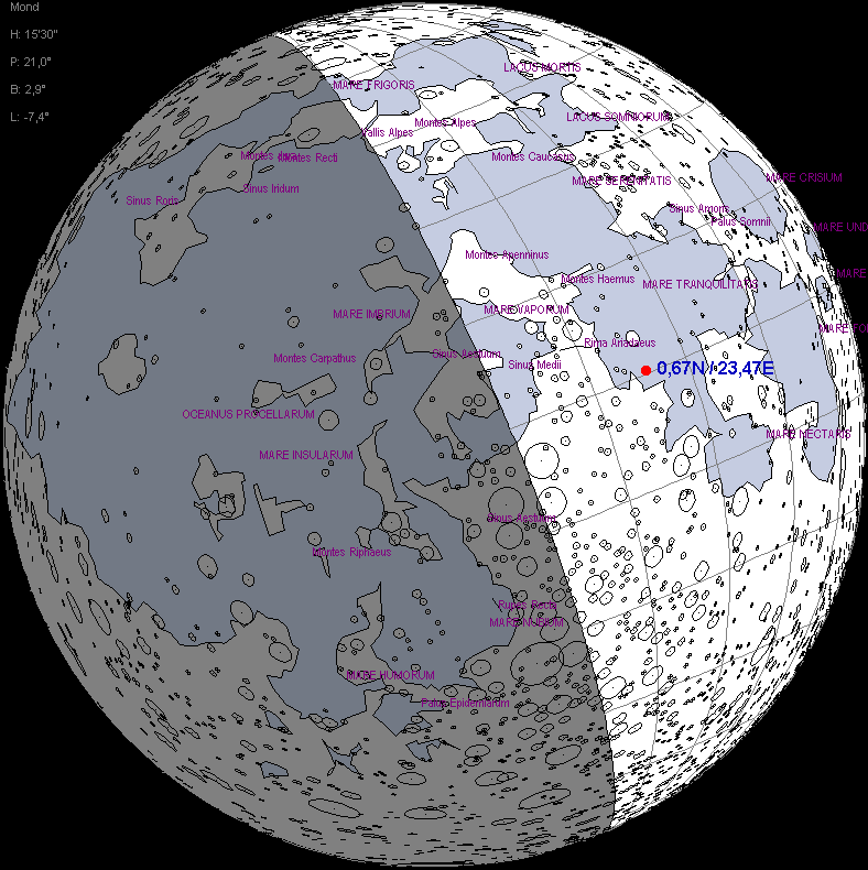Apollo 11 Mondphase während des Starts vom Mond am 21.7.1969 um 17:54:01 Uhr UT. Die Sonne stand etwa 25° über dem Horizont am Landeplatz