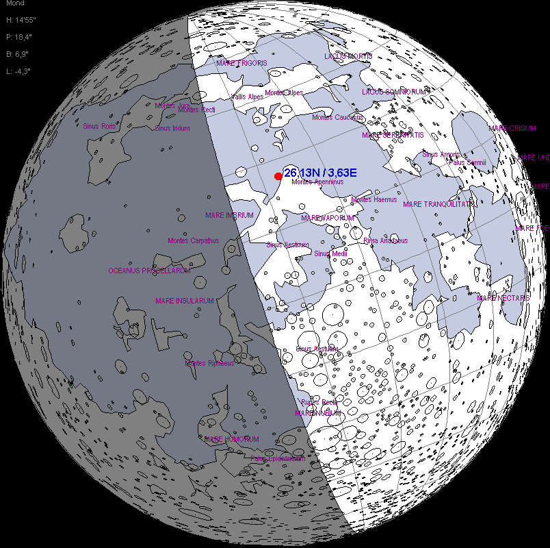 Apollo 15 Mondphase während der Landung am 30.7.1971 um 22:16:29 Uhr UT. Die Sonne stand etwa 13° über dem Horizont am Landeplatz
