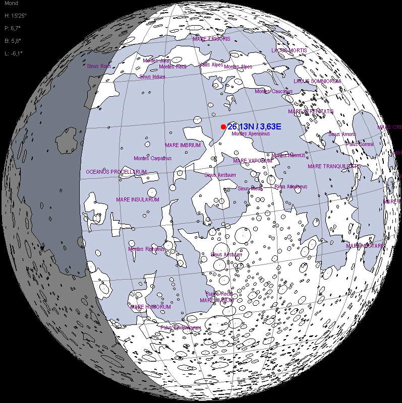 Apollo 15 Mondphase während des Starts vom Mond am 2.8.1971 um 17:11:22 Uhr UT. Die Sonne stand etwa 47° über dem Horizont am Landeplatz