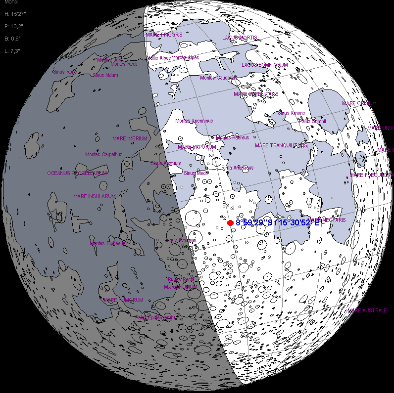 Apollo 16 Mondphase während der Landung am 21.4.1972 um 2:23:35 Uhr UT. Die Sonne stand etwa 15° über dem Horizont am Landeplatz