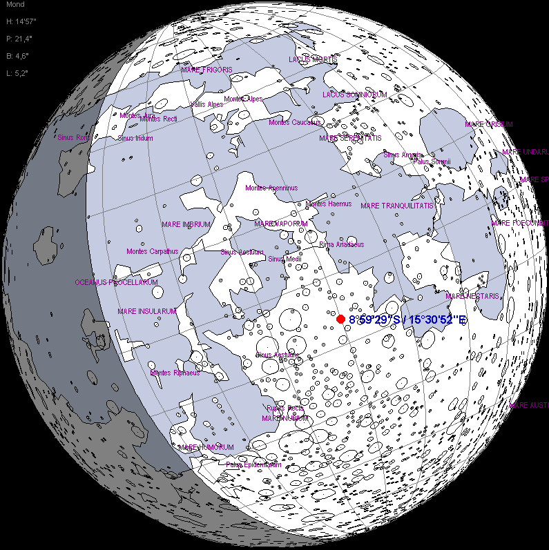 Apollo 16 Mondphase während des Starts vom Mond am 24.4.1972 um 1:25:48 Uhr UT. Die Sonne stand etwa 50° über dem Horizont am Landeplatz