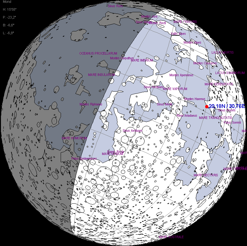 Apollo 17 Mondphase während des Starts vom Mond am 14.12.1972 um 22:54:37 Uhr UT. Die Sonne stand etwa 50° über dem Horizont am Landeplatz