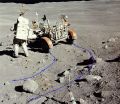 ... Das Mondauto hat den Spuren der Hinterräder zufolge gerade scharf rechts abgebogen. Dummerweise haben hier die Räder der Vorderachse keine Abdrücke verursacht. Allen Gesetzmäßigkeiten der Mechanik zufolge, die ich als (studierter